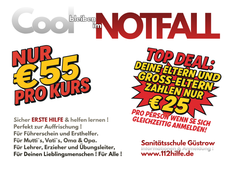 Anerkannter Kurs nach §19 FeV. Anerkannt vom Amt für Strassenbau und Verkehr Mecklenburg Vorpommern. Anerkannte Stelle für die Ausbildung ERSTE HILFE. (s. Impressum)Zertifikat ist gültig im Bundesland MV an jeder Führerscheinstelle als Nachweis über den erforderlichen Erste Hilfe Kurs .